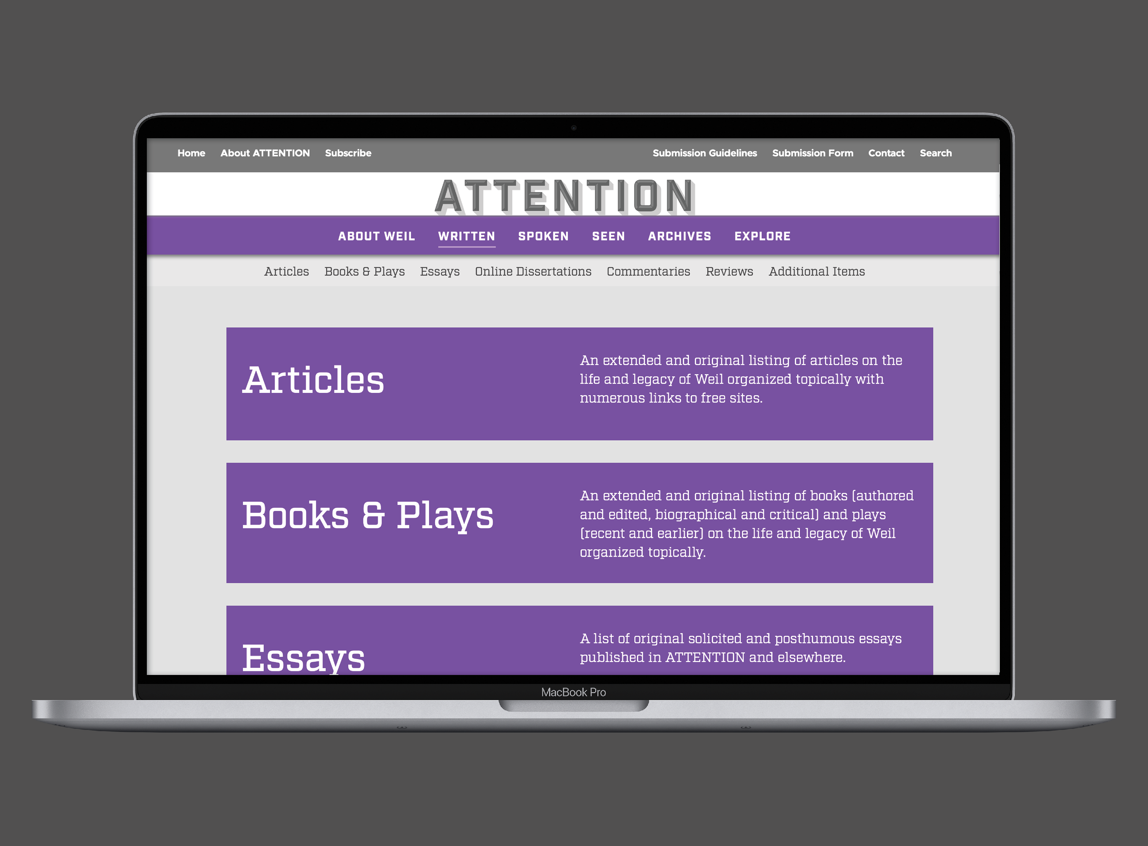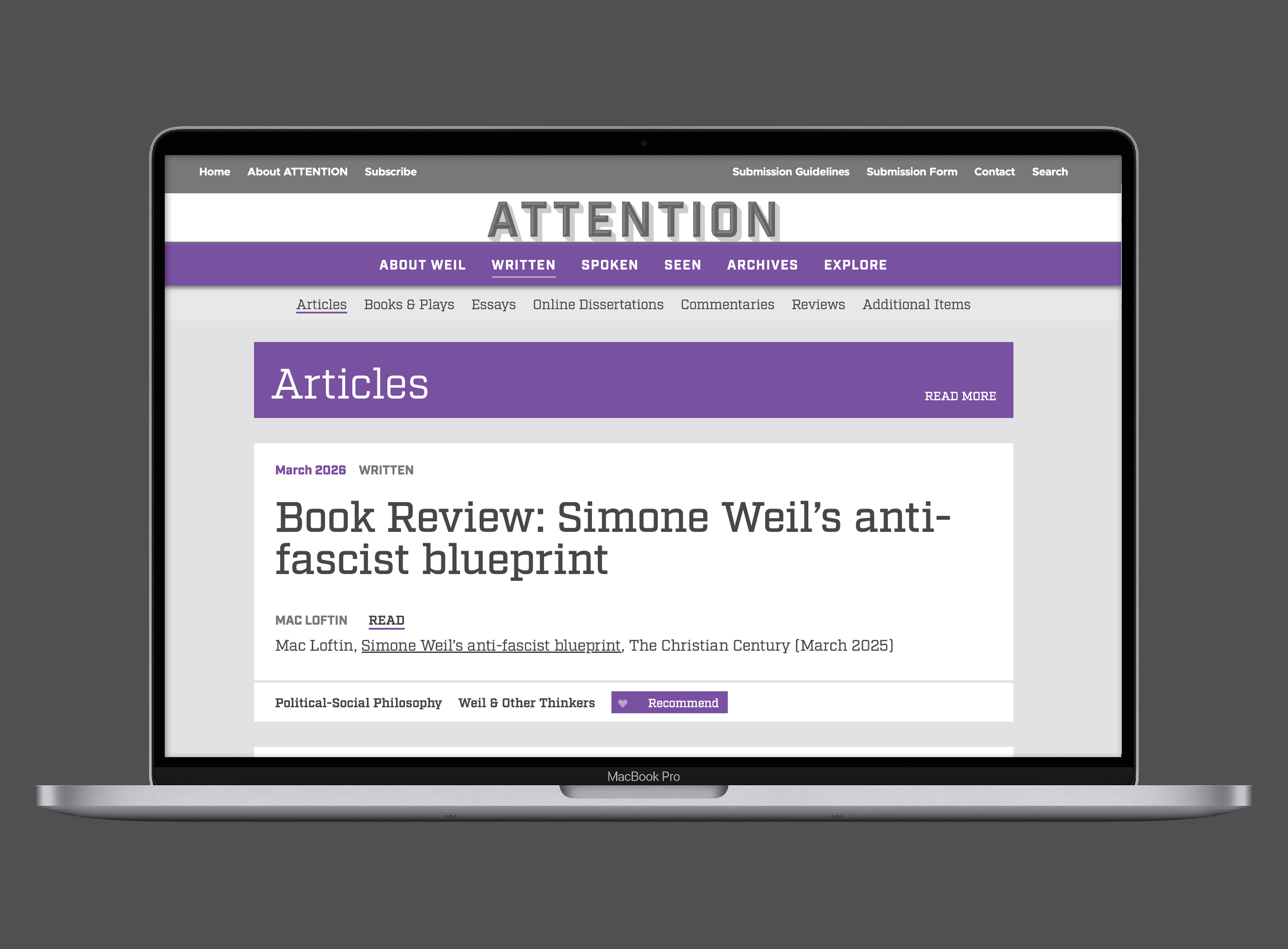 Branding and web design for the launch of a database site consisting of an ongoing collection of Simone Weil work highlighting her life and manner of death—both characterized by attention—and her legacy and influence on contemporary writers and issues.